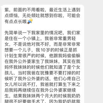 【紫,前面的不用看啦,最近生活上遇到点烦恼,无处倾吐就想到你啦,可能会有点点长哦[淡淡的] 先简单说一下我家里的情况吧,我们家是住在一个小镇上,我爸非常重男轻女,不是说他对我不好,而是非常非常想要一个儿子,我10岁的时候正是抓计划生育很严的时候,他跟我妈偷偷躲在我外公外婆家生了我妹妹,其实在我妈怀我妹妹的时候他们就知道了是个女孩儿,当时我爸在犹豫要不要打掉的时候听了我外公外婆的话,他们心疼自己女儿所以说不打,我爸就打算生下来之后我妈再继续住在我外公外婆家继续生,