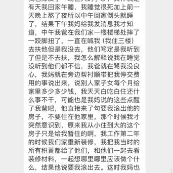 可能也是我妈说的这些点醒了我爸吧,他直接来了句要我滚出他的房子,不要住在他家里,那个时候我才突然意识到,原来我从小住到大的这个房子只是给我暂住的啊,我工作第二年的时候我们家重新装修,我把我当时的所有积蓄都给了他们,和他们一起去看装修材料,一起想哪里哪里应该做个什么,结果他说要我滚出去。这时我妈也意识到严重性了,就开始打圆场说骂我几句算了,要我认错,我怂,我认错了,他还是没有理我,只是之后也没有提过让我搬出去。