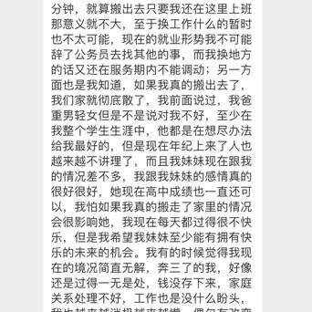 我前面说过,我爸重男轻女但是不是说对我不好,至少在我整个学生生涯中,他都是在想尽办法给我最好的,但是现在年纪上来了人也越来越不讲理了,而且我妹妹现在跟我的情况差不多,我跟我妹妹的感情真的很好很好,她现在高中成绩也一直还可以,我怕如果我真的搬走了家里的情况会很影响她,我现在每天都过得很不快乐,但是我希望我妹妹至少能有拥有快乐的未来的机会。