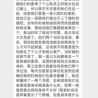 就这样僵持了一两个月吧,后来就是他们去省里检查身体做准备什么的,结果一检查就查出我妈身体不太好(我爸的说法是卵巢里长了个肿瘤,但是具体是什么他也说不清而且我爸很喜欢夸大说辞),总之我妈的备孕只能搁置了。